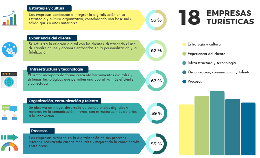 Estos datos reflejan que la transformación digital en el sector turístico de Lanzarote y La Graciosa está avanzando con paso firme. Aunque la mayoría de las empresas se encuentran aún en una etapa inicial, los progresos en experiencia de cliente, tecnología y talento son evidentes. El gran reto sigue estando en reforzar la estrategia digital y optimizar los procesos internos, con el objetivo de consolidar un entorno empresarial más competitivo, eficiente e integrado.